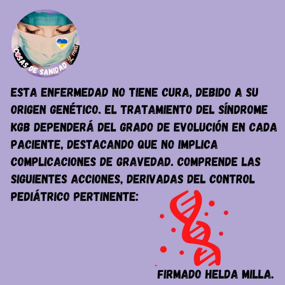 Esta enfermedad no tiene cura, debido a su origen genético. El tratamiento del Síndrome KGB dependerá del grado de evolución en cada paciente, destacando que no implica complicaciones de gravedad. Comprende las siguientes acciones, derivadas del control pediátrico pertinente: